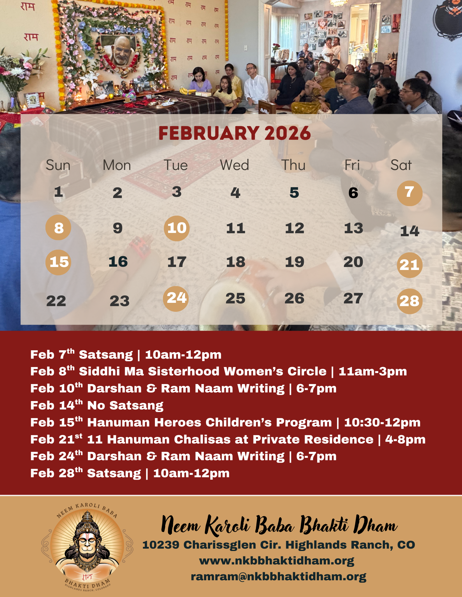 Due to popular request, NKB Bhakti Dham will remain open until 5 PM for those who wish to offer prayers, meditate, sing bhajans, or chant—allowing more time to be with Maharajji, Hanuman, and Ram. This additional time is to support those for whom the morning hours don’t work.